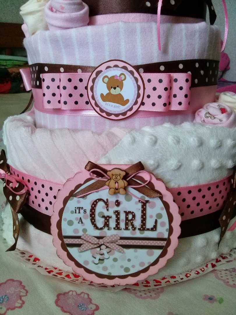 - Торт. Для поделки понадобятся: памперсы, плюшевая игрушка, элементы декора, атласные ленты разных цветов, носочки. Памперсы завернуть в трубочки и сформировать из них круг. Закрепить заготовку атласной лентой, завязав бантик. Сделать еще несколько заготовок разных размеров. Сконструировать торт и украсить.
