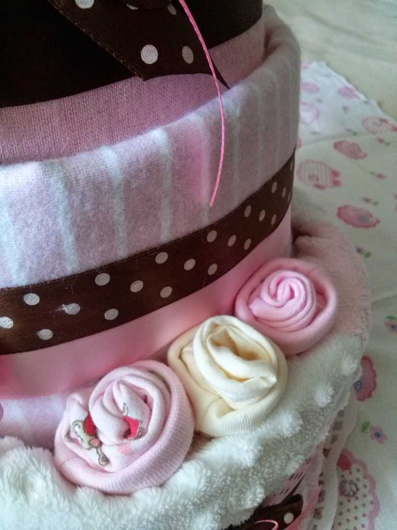 Кстати, трубочки можно делать не только из подгузников, но и из маленьких полотенец, пеленок, детских вещей, а можно и вовсе для составления ряда использовать небольшие детские игрушки. Таким образом часто оформляют один из ярусов (обычно верхний, небольшой).
