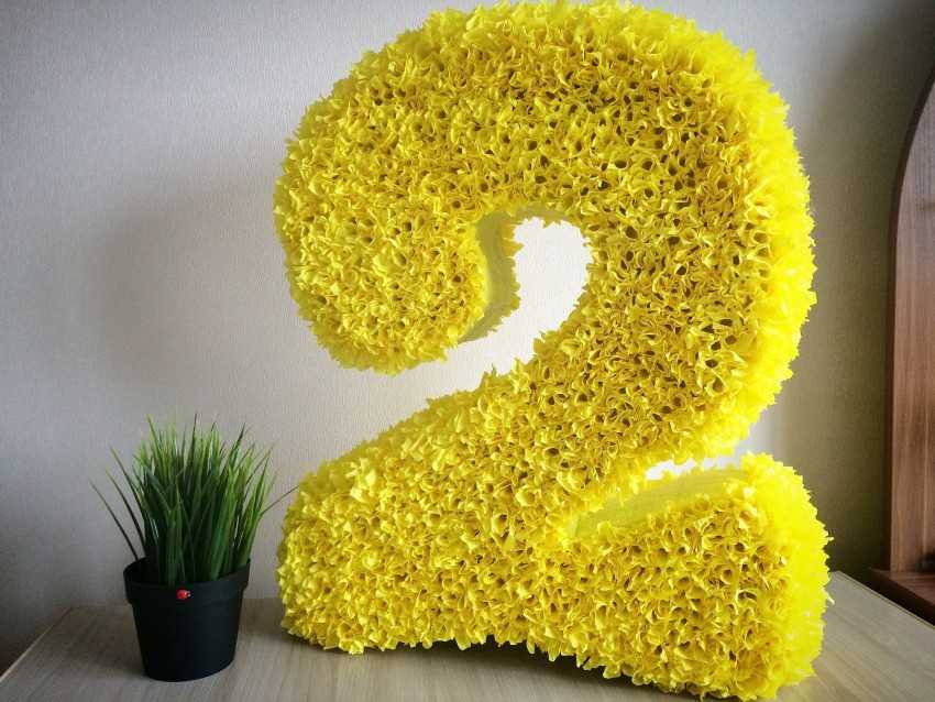 При помощи степлера и клея необходимо закрепить цветки на поверхности цифры. Оттенки цветков можно равномерно чередовать для большей выразительности. Теперь можно разметить цифру в запланированное место, отойти и полюбоваться.