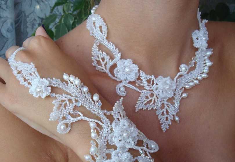 Для изготовления свадебного колье как нельзя лучше подходит плетение из бисера и бусин. Эта техника, безусловно, сложнее, чем декорирование кружева, но, освоив её, оторваться невозможно. Украшения, созданные таким образом – произведения искусства. В мастер-классах приводятся примеры великолепных колье для невесты. Первый может взять на вооружение начинающий мастер. Ожерелье, о котором идёт речь, выполнить несложно и достаточно быстро.