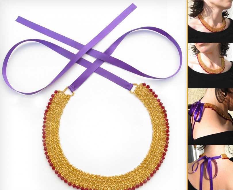 В следующем даются подробные схемы для мастериц. Следуя всем советам и набравшись терпения, можно сделать шикарный подарок невесте. Это колье в работе сложнее, но оно того стоит!