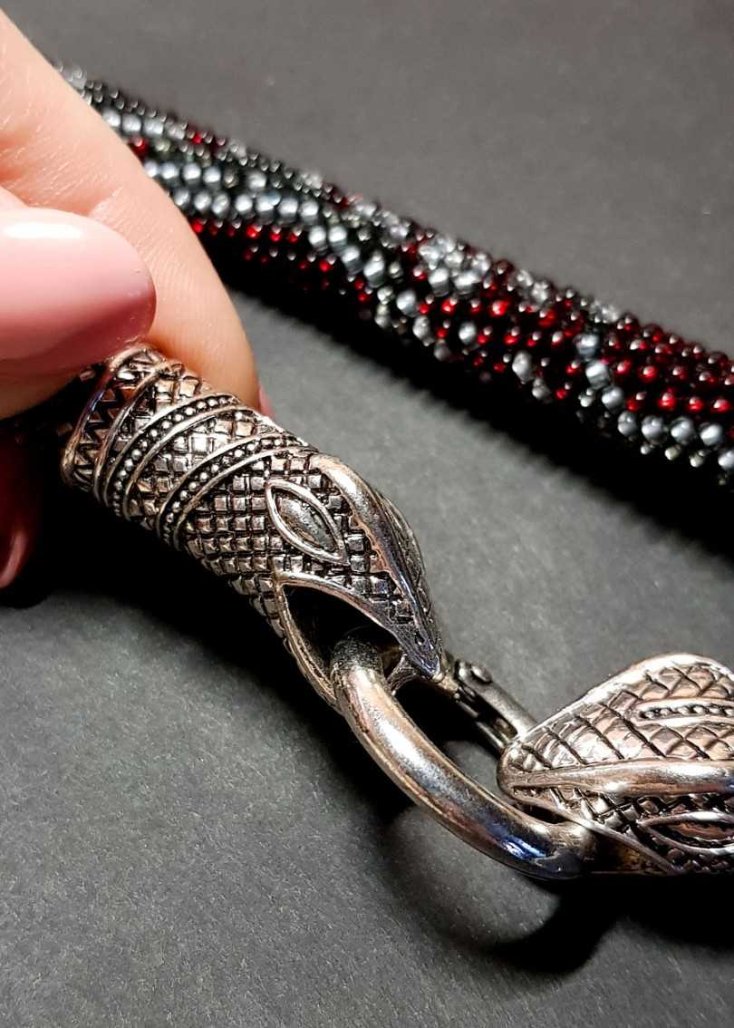 Действия полностью дублируются, пока коса не будет сплетена полностью. Стопорные бисеринки снимаются, а также устраняют ненужный бисер для выравнивания изделия. По последним бисеринам пару раз проходят леской во избежание их падения. Концы скрепляются узелком. Заключительный этап предполагает повторение, чтобы сделать петельки для концевика, в него будет вставлена застежка.