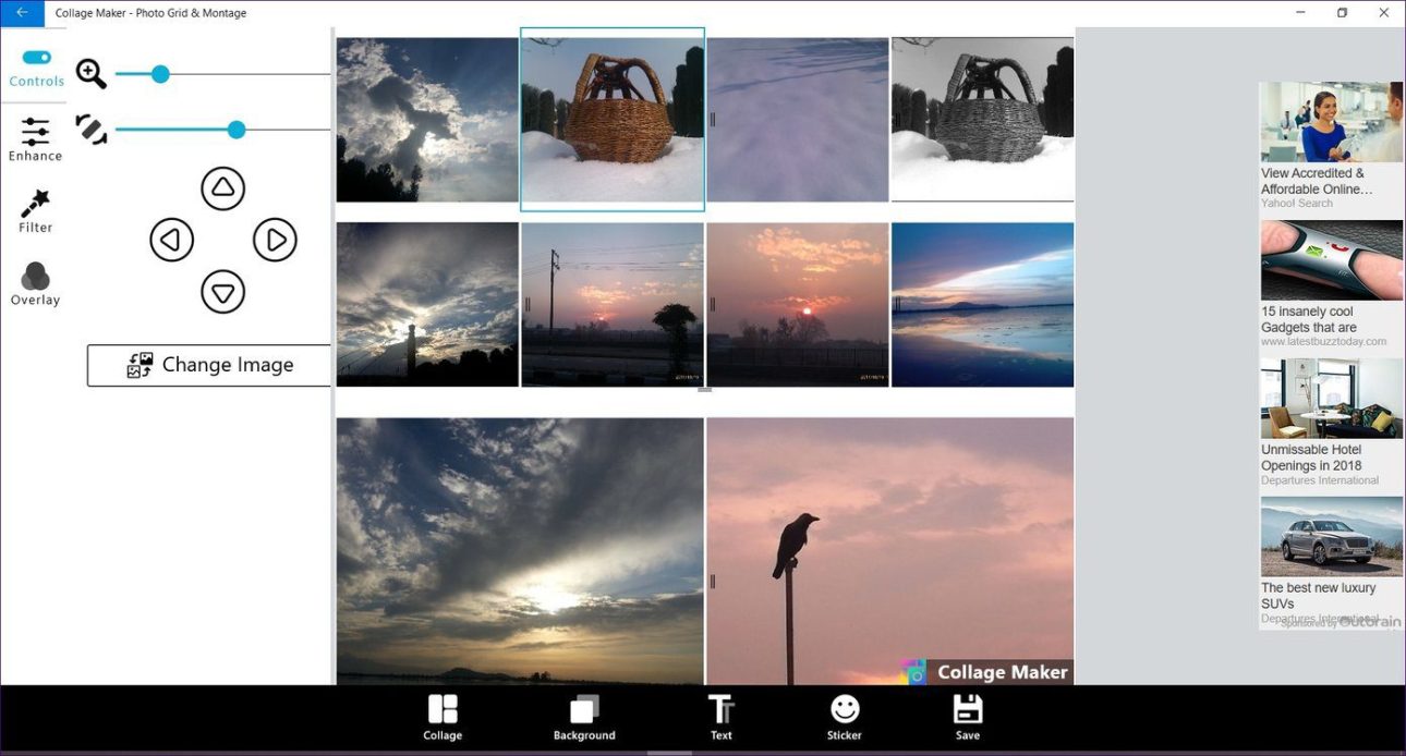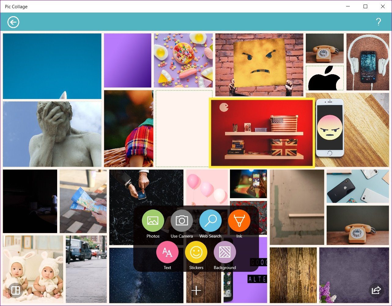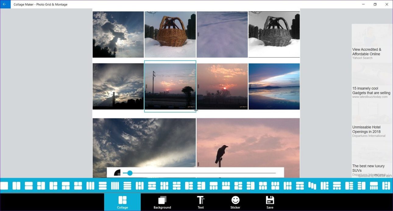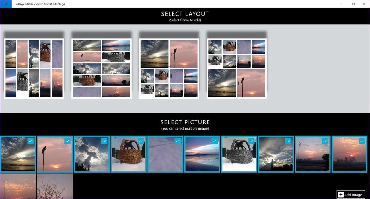 Это также специальный инструмент для создания коллажей. Вы можете создавать коллажи в форме сетки и произвольного стиля. Интерфейс этого приложения с возможностью добавления 10 изображений немного отличается и лучше, чем у остальных. Вы можете добавить много фотографий, которые видны в нижней панели. Нажатие на них добавляет или удаляет их из коллажа.