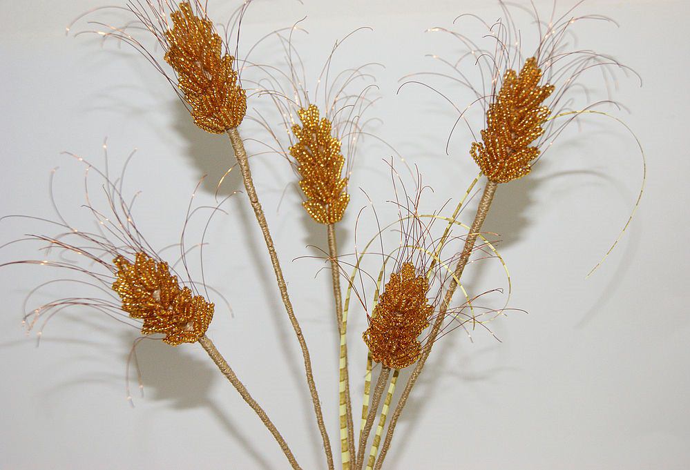 В этой двухслойной композиции использовано 30 коротких пшеничных колосьев. Существует множество способов применения этих изделий. Их можно выполнить на длинных стеблях и соединить с цветами для создания осенней композиции или использовать сами по себе – сделать пучок колосьев и перевязать его лентой. Если вы хотите создать другие композиции с пшеничными колосьями, подсчитайте, сколько проволоки и бисера вам понадобится. Используйте сведения о количестве материала, приведенные для изготовления одного колош.