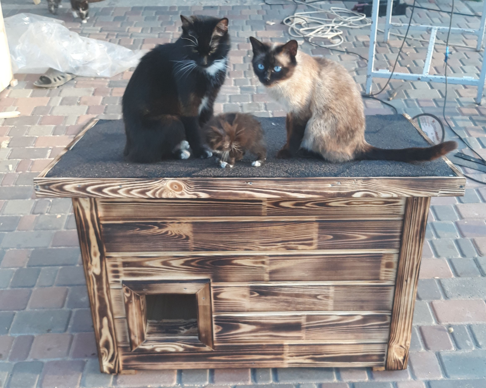 Домик рассчитан на нескольких кошек. Выполнен подъем в виде мостика. Расположен на постаменте, чтобы в случае подтопления, вода не попала в жилище. Это еще и дополнительная площадка для животных.