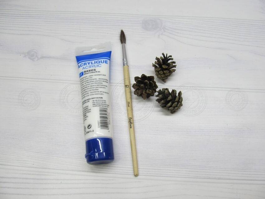 Иногда для композиции нужны белые шишки. Бытует мнение, что их можно отбелить Белизной. Однако опытные рукодельницы опровергают такую версию. Лучше не тратить зря силы, время и здоровье (хлор — довольно опасное вещество). Воспользуйтесь сразу белой краской (акриловой, гуашью, из баллончика и т. п.).