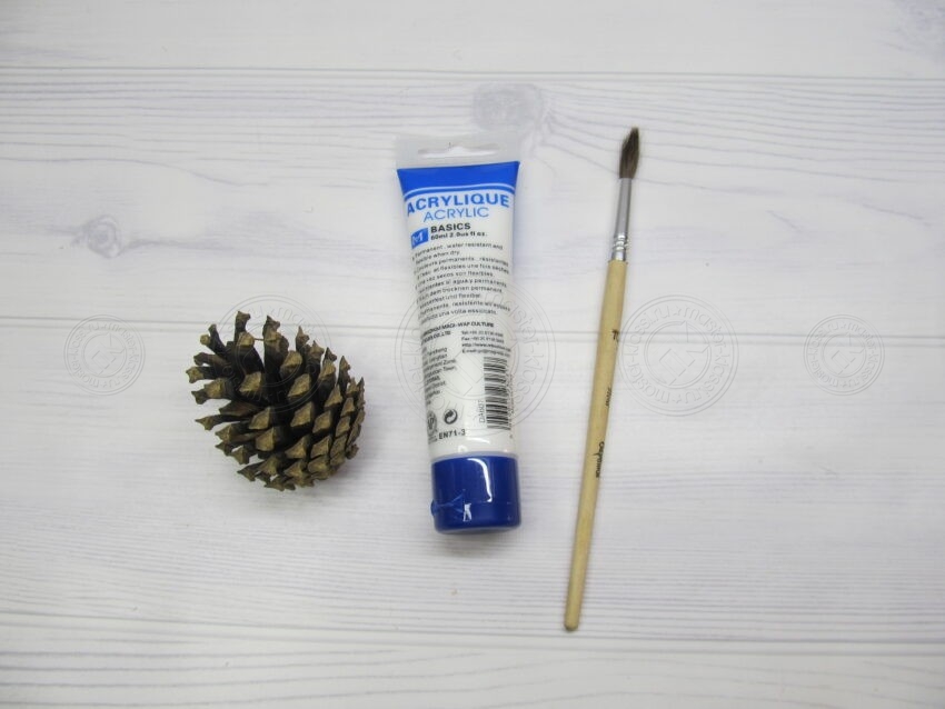 Шишка наиболее близкий к ели образ. Именно поэтому в советских игрушках она обыгрывалась множество раз. Те кто постарше, непременно вспомнят хотя бы одну такую у своих родителей. Стеклянная, окрашенная разными цветами, лежащая в коробке набитой ватой. Мы не сможем с вами сделать точно такую же, но у нас в распоряжении есть другое количество подходящего материала. Например, мы можем взять несколько штук, склеить их между собой, после чего все стилизовать. Нам нужна будет акриловая краску, так как именно она лучше всего показывает себя со сложными поверхностями. Та же гуашь вряд ли подойдет, так как она потрескается и слетит.