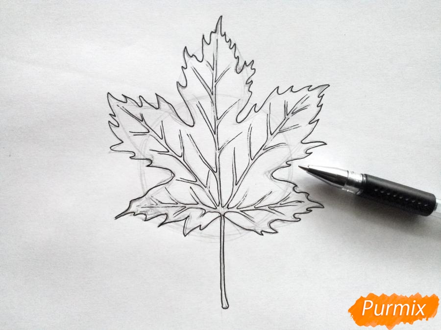 Линером или мягким карандашом делаем контуры пожирнее и получаем вот такой нарисованный лист конопли.