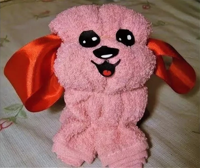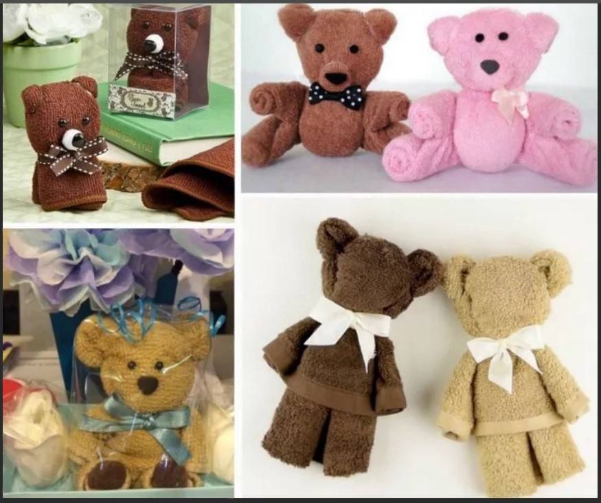 Вообще из самого обычного махрового полотенца можно сделать самые разные фигурки: это могут быть лебеди, слоники, зайчики или сердца. Актуально к любому празднику, недорого и несложно. Рассмотрим, как сделать мишку из полотенца поэтапно.