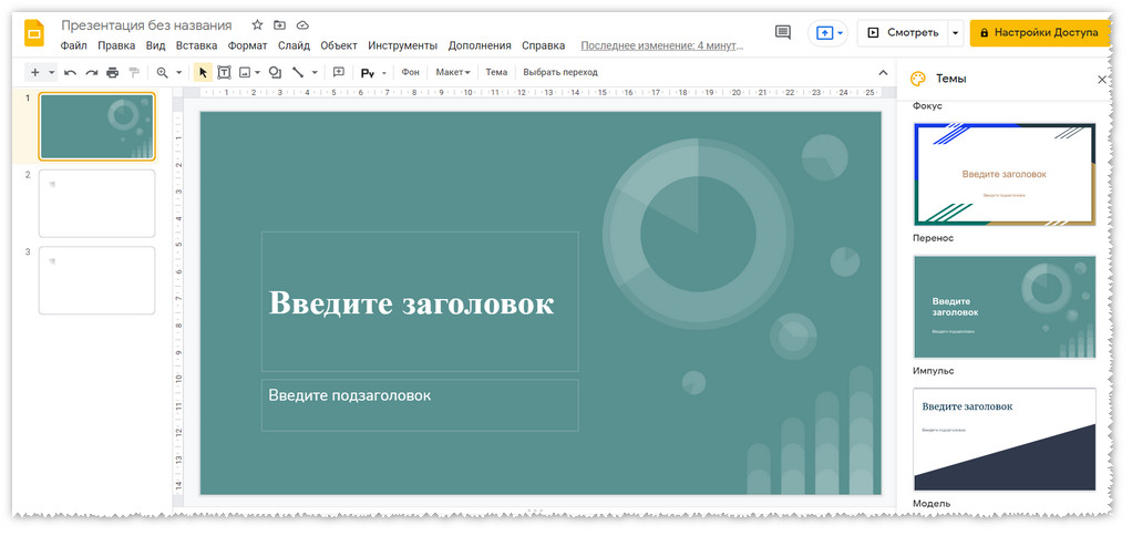 Наряду с текстовым редактором на Google диске представлены Google презентации. Это удобное приложение для создания онлайн-презентаций. В наличии представлено ряд шаблонов, доступных для редактирования.