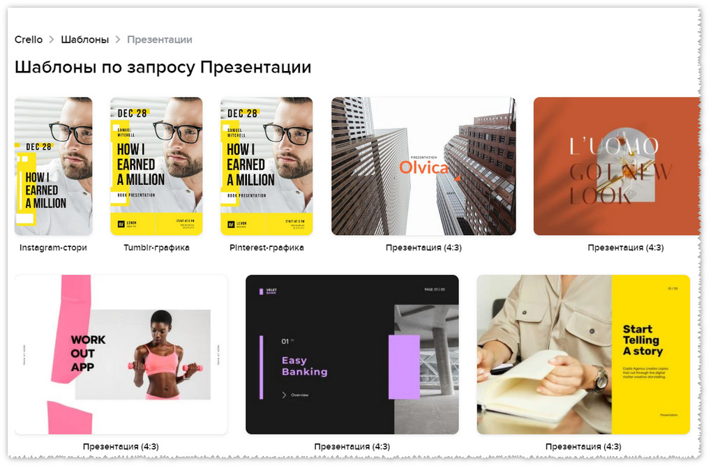 В Crello помимо стандартного формата 4:3, есть шаблоны презентаций вертикальной ориентации.