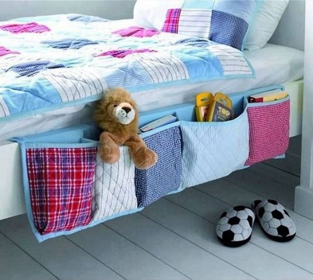 Существуют и другие варианты изготовления аксессуаров для хранения игрушек. Их можно сделать, например, из флиса. Подойдёт и любая другая ткань. Материи для работы понадобится много, около 4 метров. Из дополнительных материалов и инструментов нужны люверсы, молоток для них, джинсовая нить и 2 булавки.
