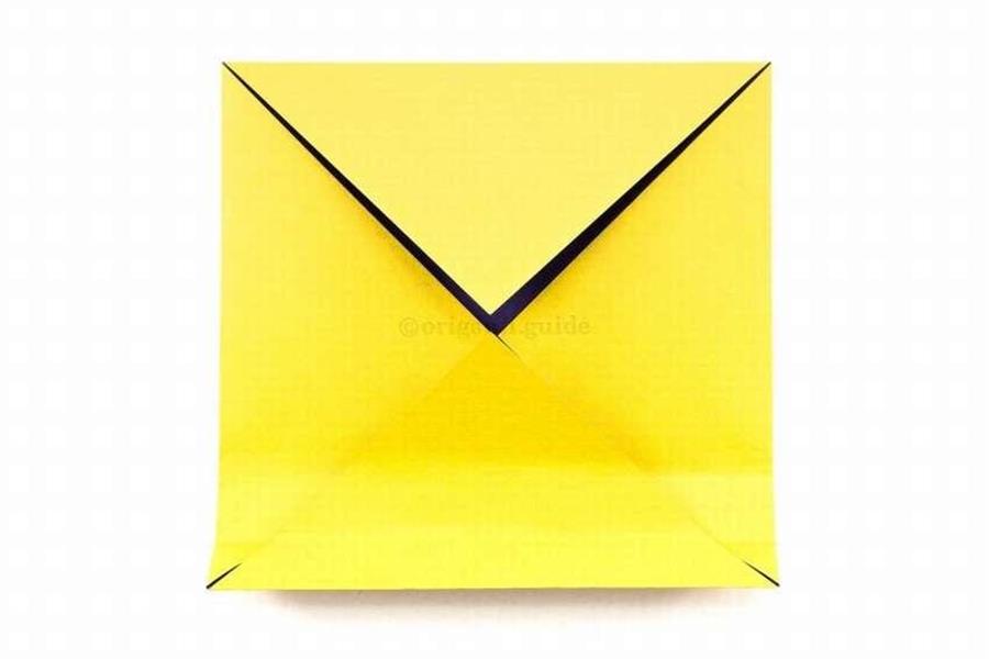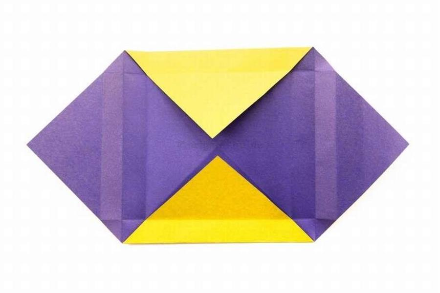 Возьмите квадратный лист бумаги и сложите его по диагоналям, после чего переверните на другую сторону. Загните уголки так, чтобы их вершины совпадали с центром квадрата.