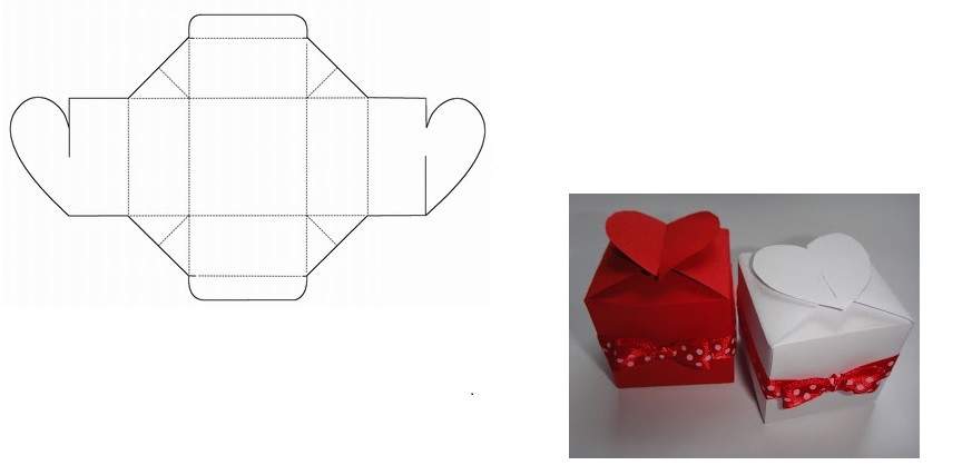 один Еще способ изготовить коробочку в форме которая, сердца будет крепиться на аккуратный бантик, схеме на представлен внизу.
