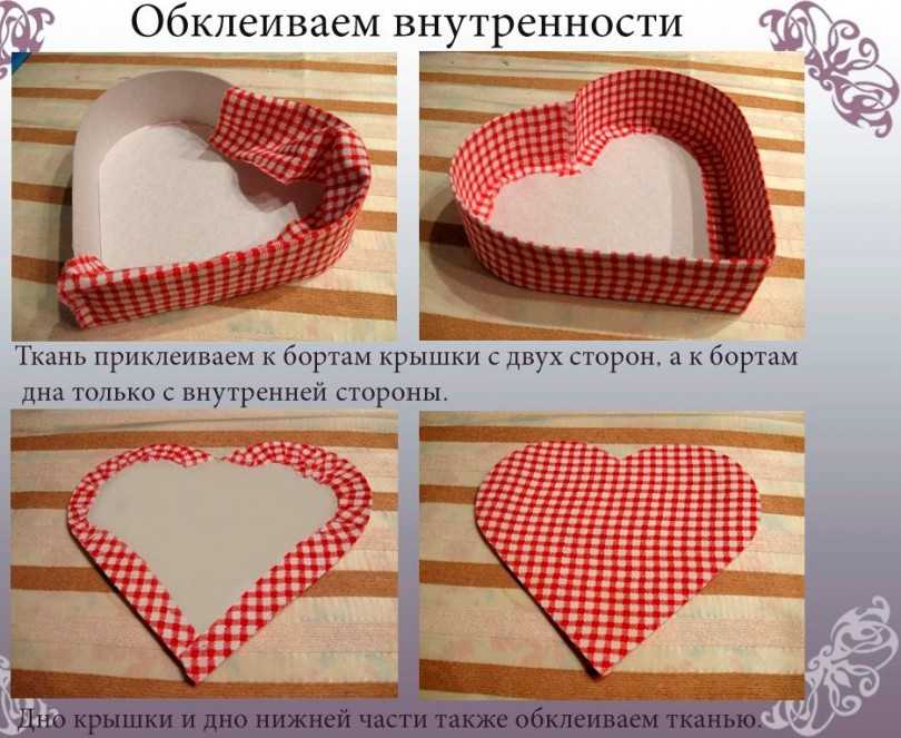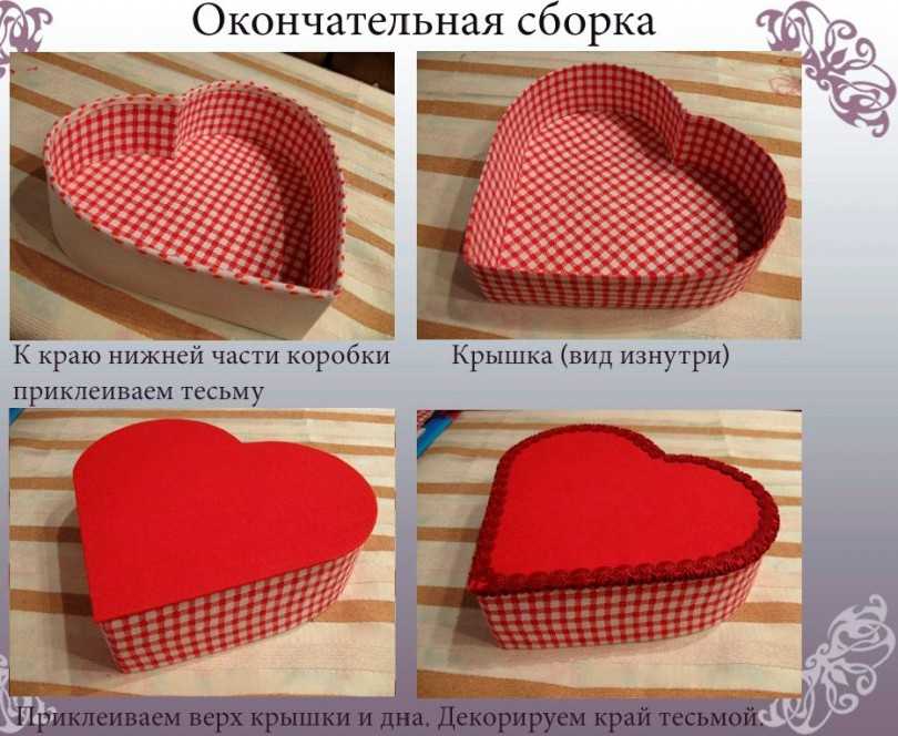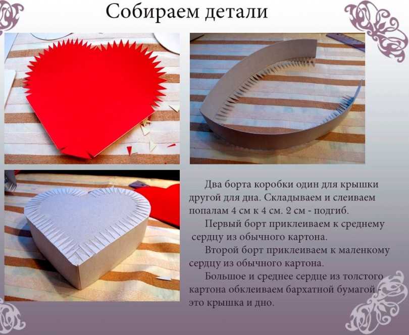 На следующем этапе изготавливается крышка. Для этого надо выполнить вертикальные разрезы на тонких деталях, приклеить их к большему сердечку и закрыть коробок крышкой. Коробка сюрприз готова! Осталось наполнить ее приятными мелочами, сладостями, положить любимые духи…