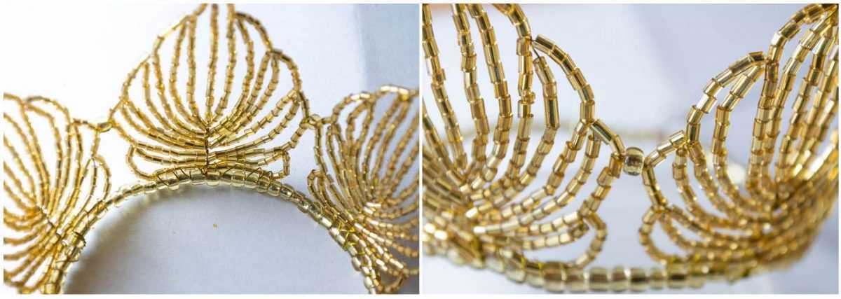 На следующем этапе мастер-класс начинает собирать корону. Берем заготовки в виде лепестков и присоединяем их к ободку. Соединение деталей между собой проходит при помощи бисера, как на фото.