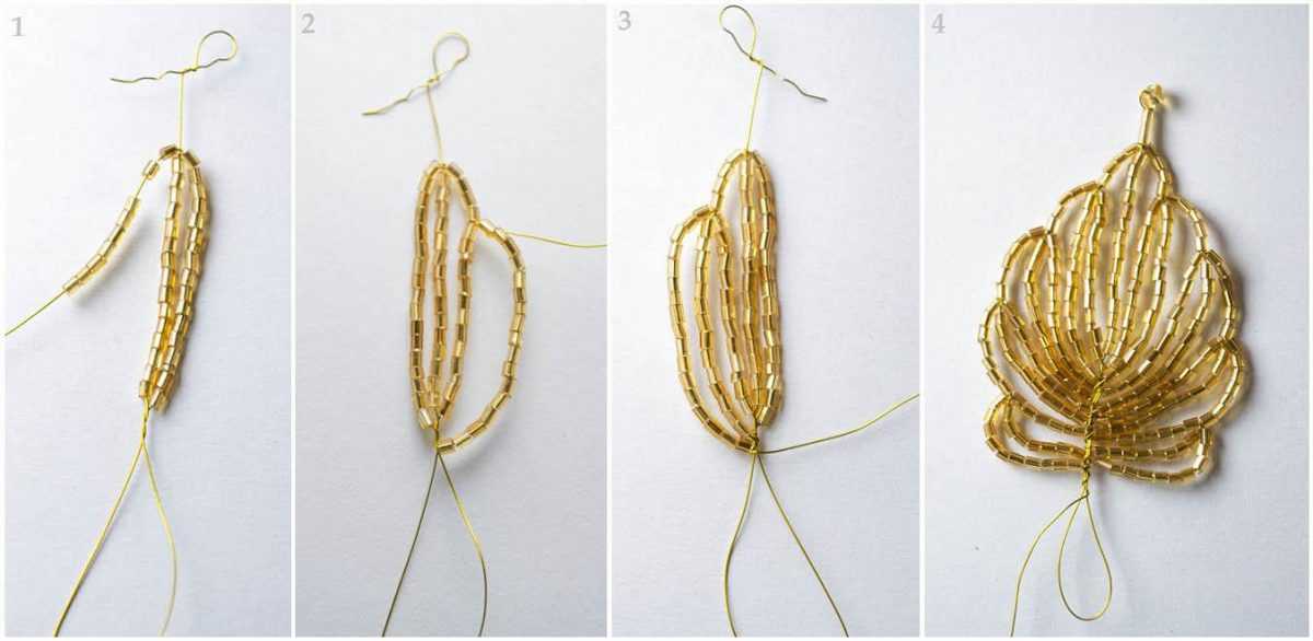 Следующим шагом нам нужно сплести детали по форме напоминающие лепесточки. Используем для этого технику французского плетения. Схема следующая: на проволочный отрезок семьдесят сантиметров в длину, нанизываем 15 штук золотистой рубки, предварительно сформировав небольшую петельку у одной из сторон. Теперь, нужно сделать петельку побольше и продолжить бисероплетение дугами. Последующую дугу формируем через 4 шт. рубки и закрепляем. Нанизываем еще рубку и создаем дугу, которая будет находиться внутри. Скручиваем проволоки у основы листика. Пошагово этот процесс можно рассмотреть по фото.