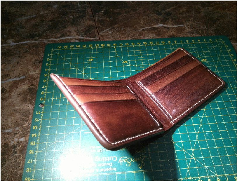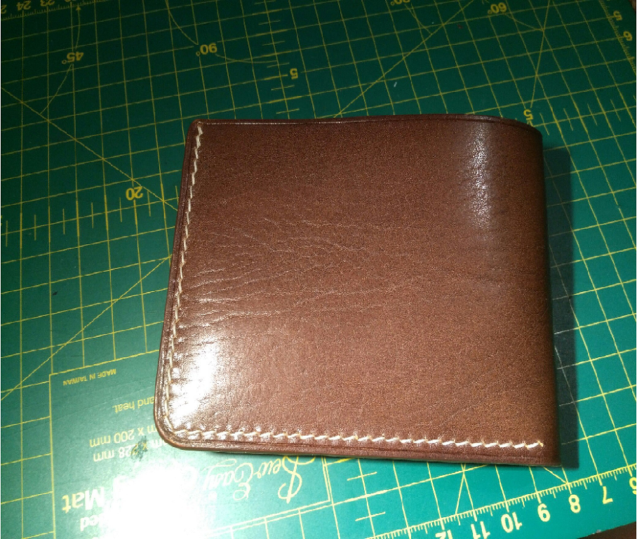 Первый кошелек вышел у меня весьма неплохим, я очень старался, потратив на изготовление целых два дня. Шов получился аккуратным и ровным, а торцы хорошо затертыми. Для оценки я решил выложить фотографии работы в одну из тематических групп соцсети, и получил от камрадов несколько положительных отзывов в духе: “Есть куда расти, но для начала очень даже неплохо и талантом ты не обделен”.