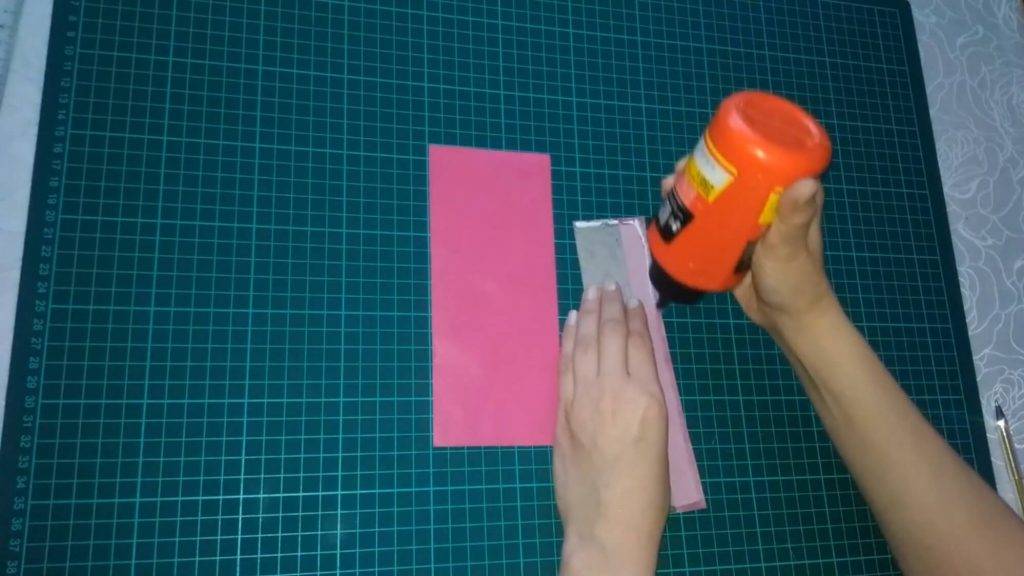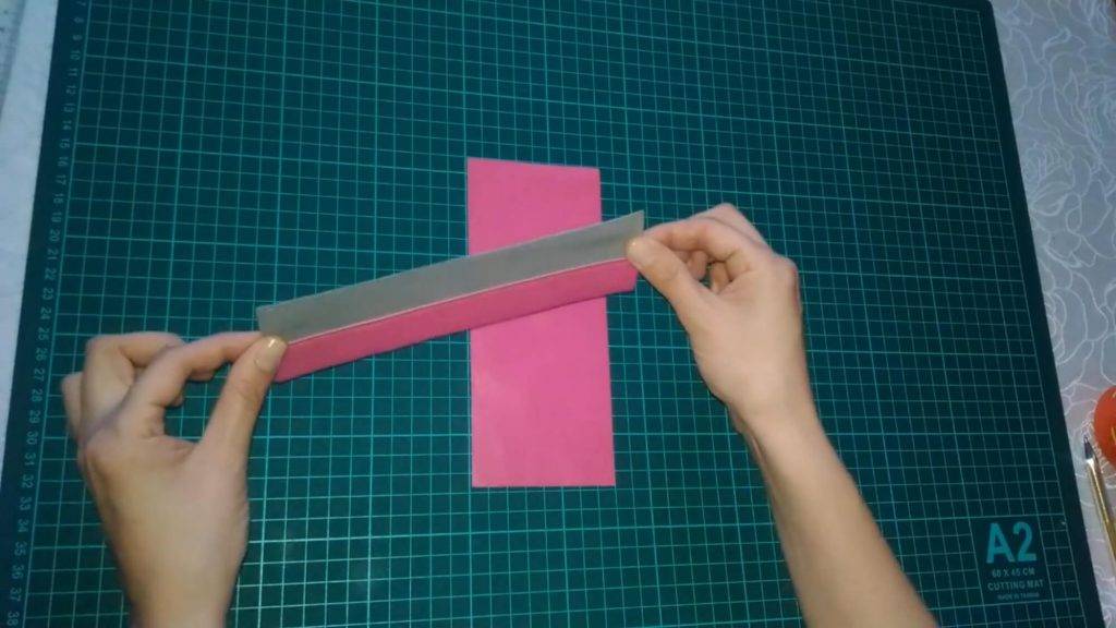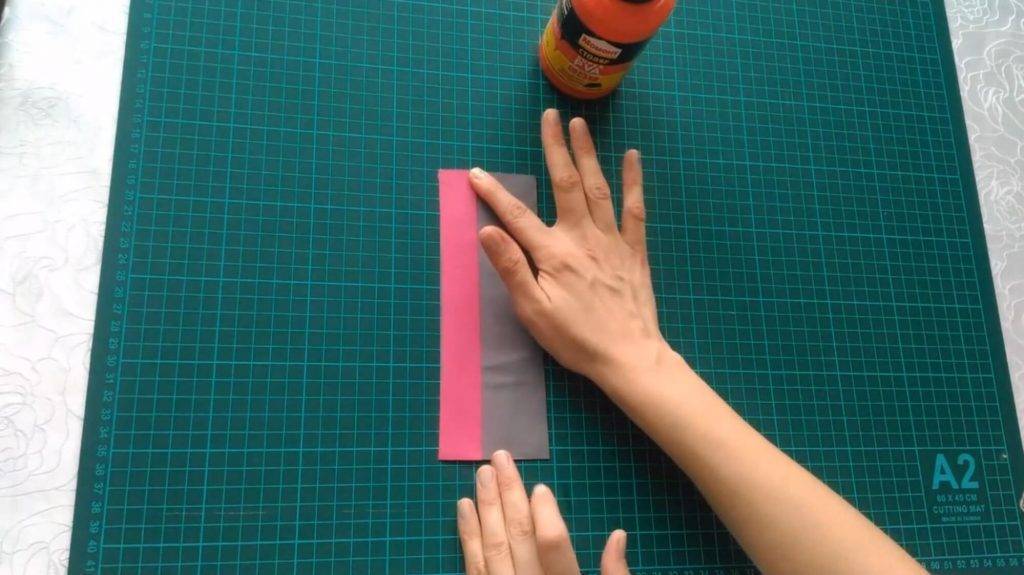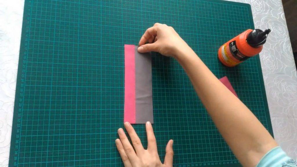 Берём 2 детали: серую, шириной 4,5 см. и розовую — 2,5 см. Отмеряем от края серой полоски 3-4 мм., проводим линию клеем и накладываем на неё “внахлёст” розовую полоску.