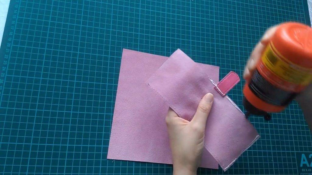 Далее по линии разметки шва с обратной стороны кожи был нанесен клей «Момент». Клей нужен только для удобства шитья, и в данном случае его можно применить любой, так как кожа будет в дальнейшем сшита нитками.