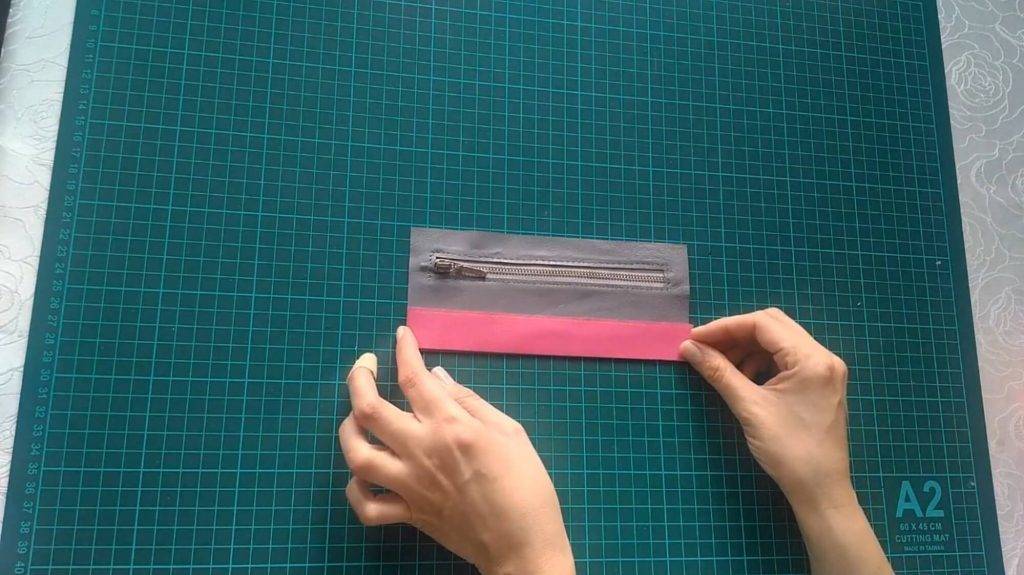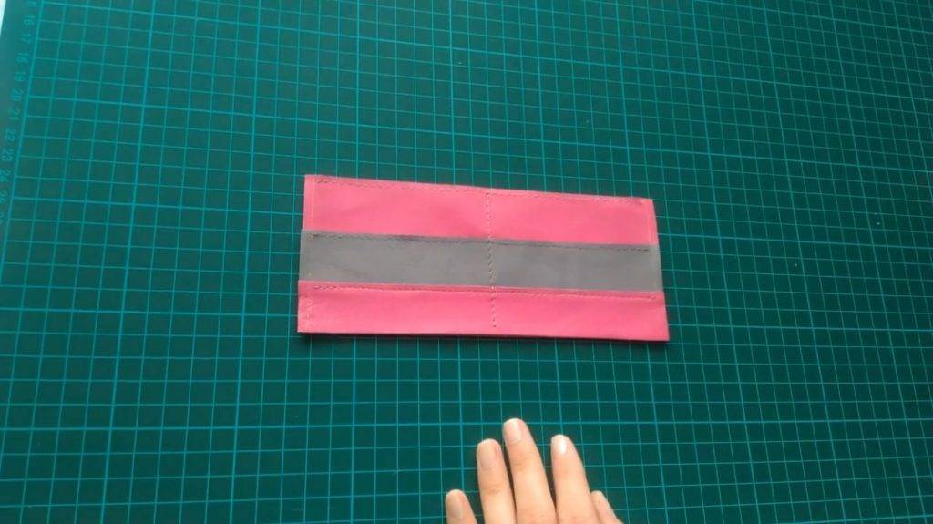 Приклеиваем и, если есть швейная машинка — прошиваем , отступив от среза розовой полоски 3 мм.