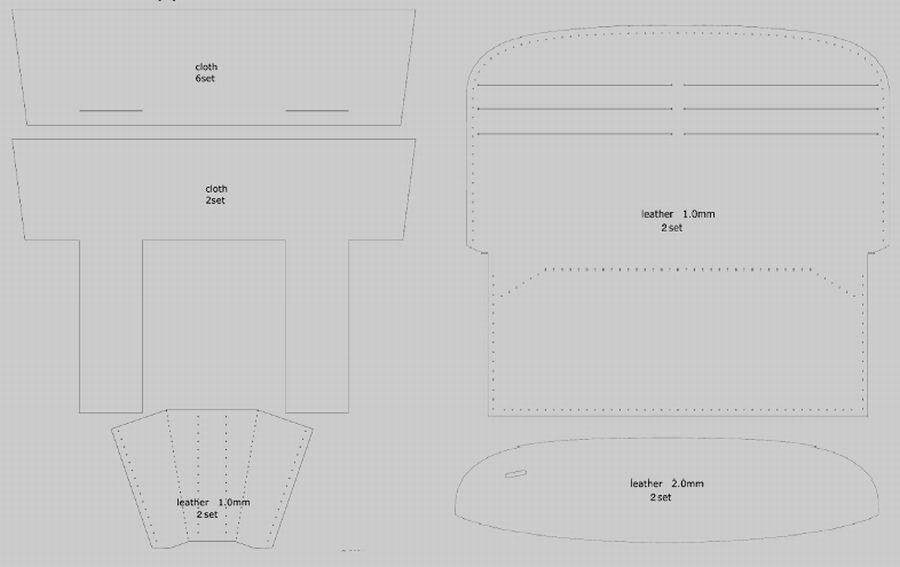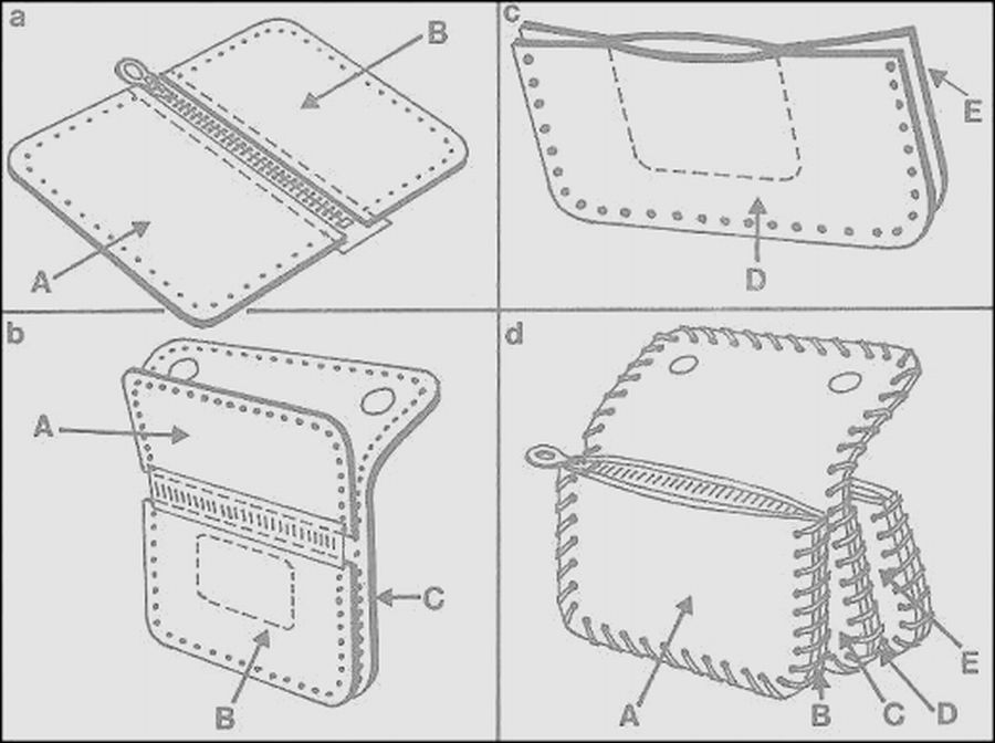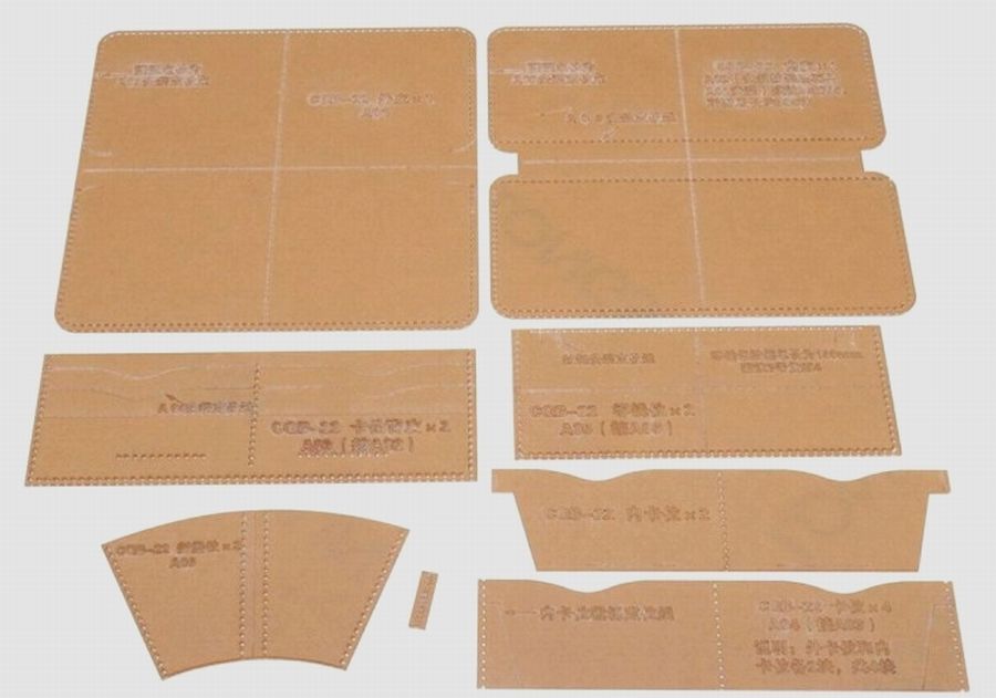 Выкройка изделия выполняется на картоне или бумаге. Используя карандаш и линейку, чертим необходимые заготовки, представленные в примерах выкройки. Вырезаем, переносим на материал. С помощью резца вырезаем готовые детали из кожи. Все образцы готовы к дальнейшей работе.
