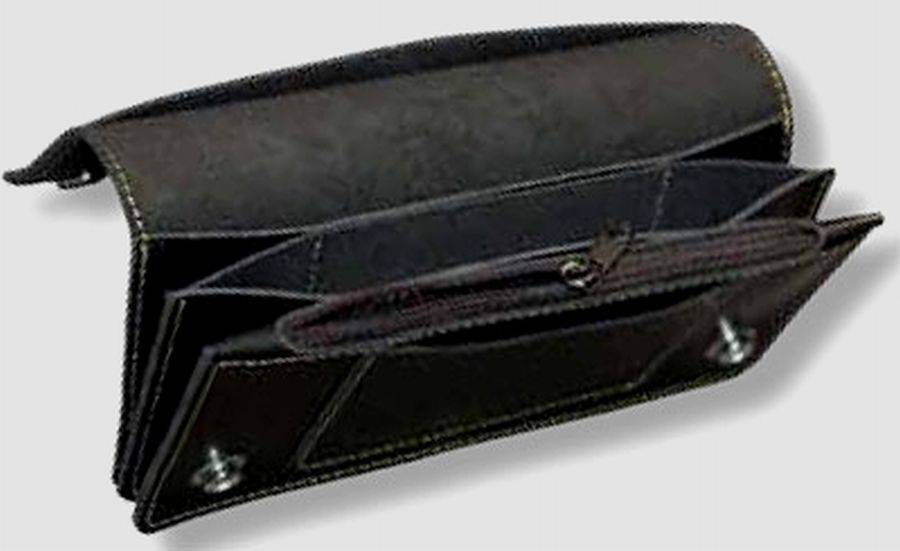 Кошелёк готов к использованию. В дополнение можно сделать петли в средней части, в которой будет располагаться ручка. По центру основы можно сделать ярлычок с кнопкой, которая будет закрывать изделие. В таком случае с одной стороны крепим кнопку, с другой пришиваем ярлычок с головкой заклёпки. Само крепление следует устанавливать до того, как будут приклеиваться карманы.