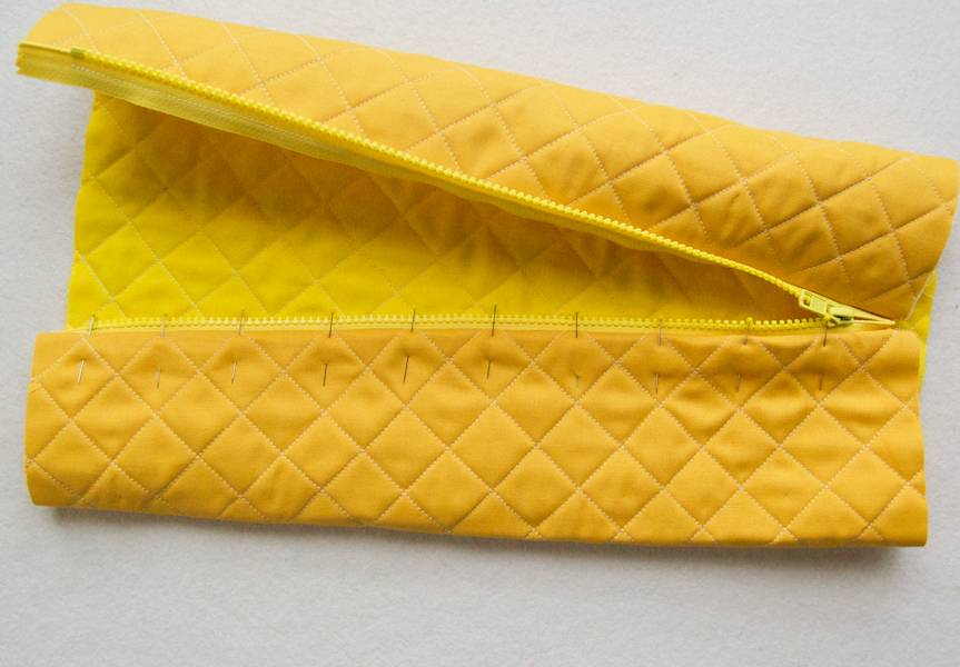 6. Далее, наконец, обе стороны крышки сшиваются вместе, где по периметру прокладывается потайная молния. Она, как никогда, получается потайной. Обязательно вставляется язычок для удобства открывания косметички. На рисунке изображены две вшитые молнии. Однако, можно вшить и одну длинную;