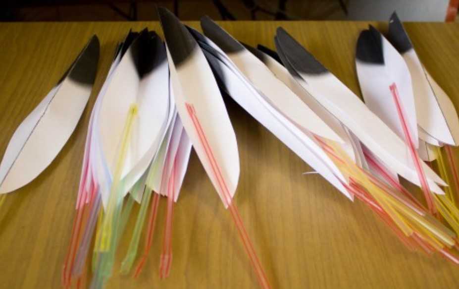 Бумагу потребуется тоненько нарезать, чтобы ширина у полосок была до 3 мм, а потом оберните скотчем или прикрепите степлером вокруг трубочки. Трех разноцветных перьев будет вполне достаточно для украшения головы индейца.