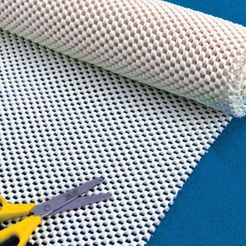 Шаг 4  | Пока трикотажные заготовки сохнут, подготовьте сетку. Обрежьте ее под размер коврика, придайте основе нужную форму. Если края сетки распускаются, проклейте их с обеих сторон клейкой лентой. |