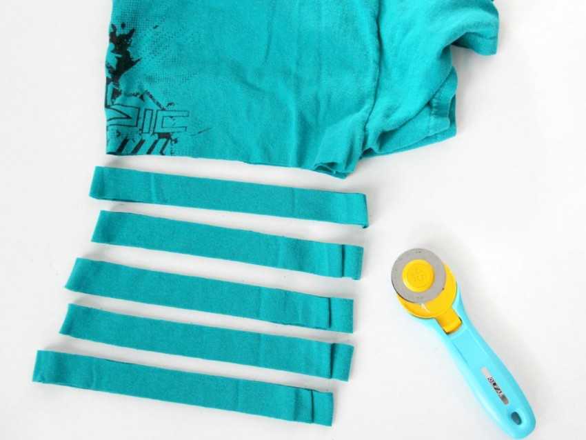 Шаг 1  | Подготовьте полоски трикотажной ткани: отпорите у футболок рукава и горловину, распорите швы. Нарежьте их с помощью острых портняжных ножниц на полоски шириной 3-4 см. Длина полос зависит от того, насколько длинный ворс вы хотите получить, достаточно 10-25 см с учетом завязывания узла и дальнейшего выравнивания. |