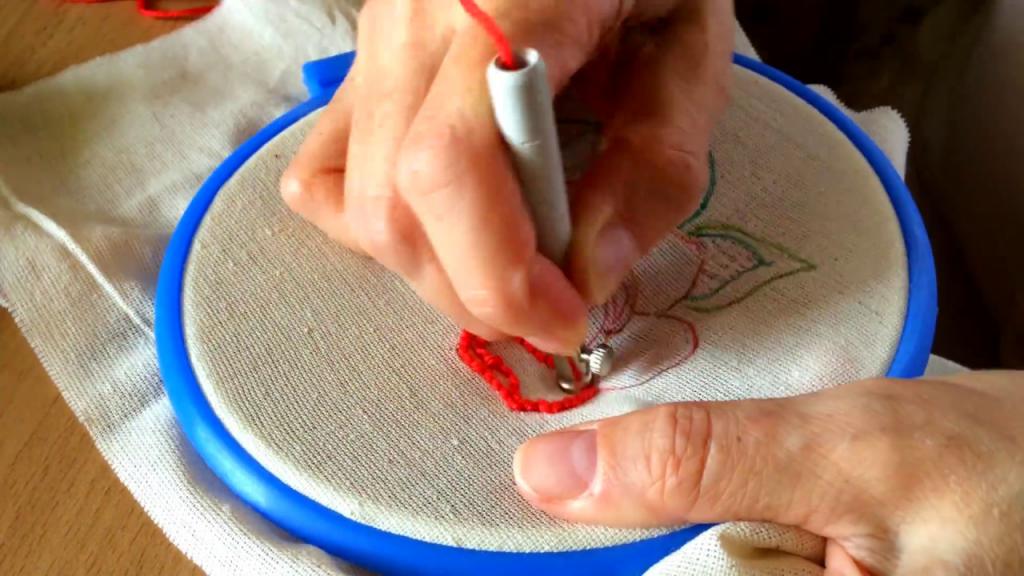 Игла для ковровой вышивки представляет собой трубочку со скошенным углом и ушком на кончике. Кроме этого, она имеет фиксатор в виде ручки, который позволяет делать петли одного размера, ведь от этого зависит результат. Еще для работы необходимо иметь пяльца или специальную рамку для закрепления ткани.