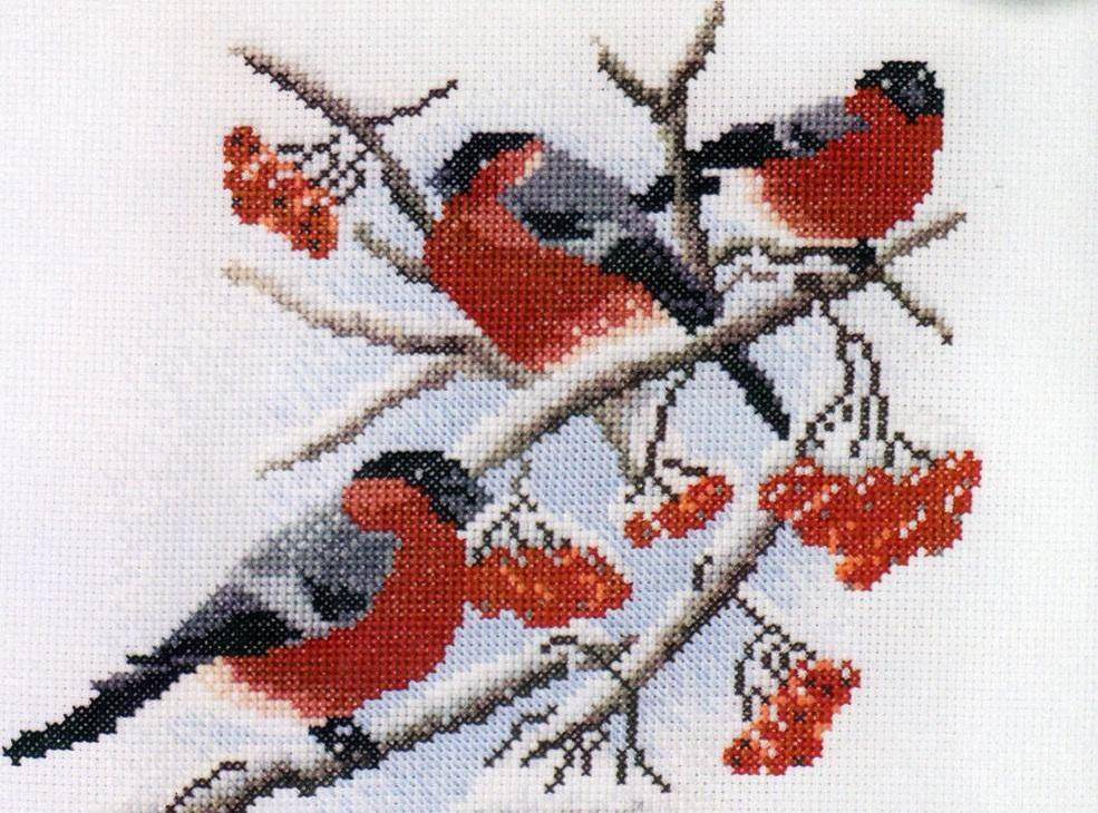 Зимняя вышивка крестом: птицы на ягодной ветке