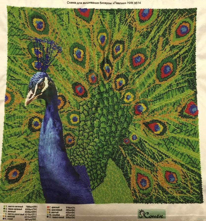 Главная проблема заключается в том, чтобы найти рисунок с готовым ключом распределения цветов мулине по каждой детали. Павлин выполняется более чем в 10 цветов. Для новичков желательно не выполнять картины больших размеров.