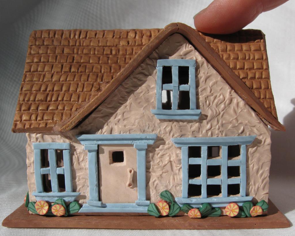 - Чтобы сделать «черепицу» на крыше, формируем пластилином шарики коричневого цвета. Расплющиваем их и прикрепляем на кровлю, немного перекрывая друг друга;