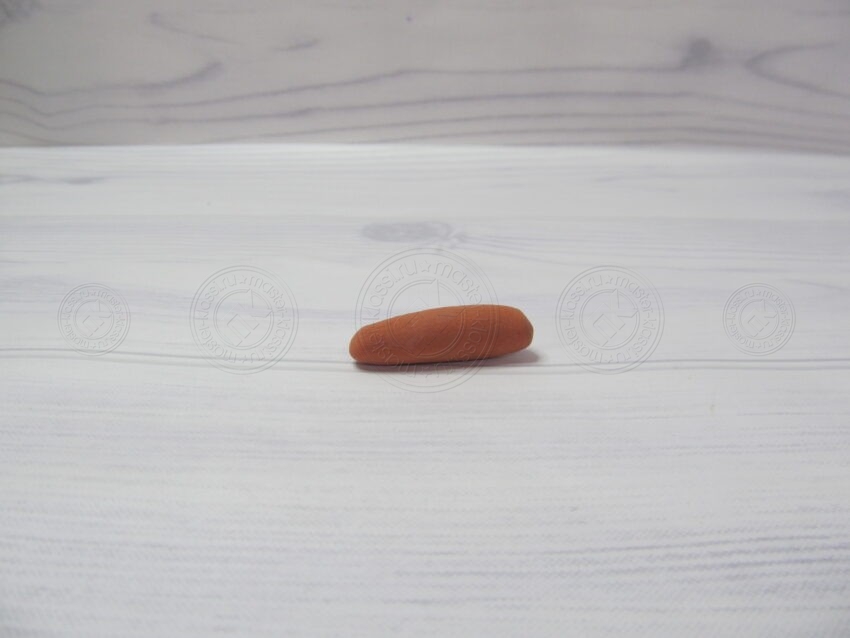 - Кусок белого, розового или бежевого пластилина слегка раскатывают в овальную форму и стекой размечают на три равные части (полосочками).