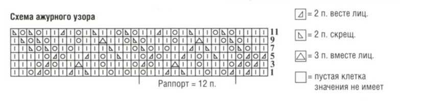- Раппорт узора: два ряда, четыре петли.