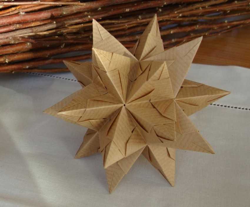 Объемная поделка звезда очень привлекает взгляды. Похожими сувенирами можно декорировать места посиделок с друзьями, праздничный обед или ужин.