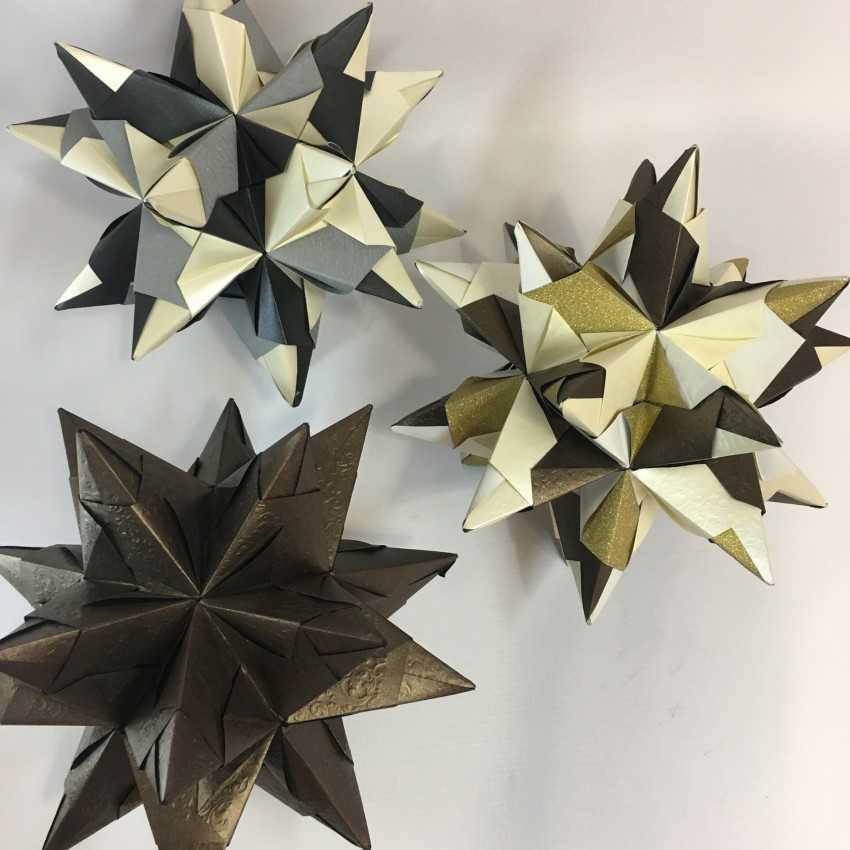 Выполняется такое изделие аналогично сюрикену(используйте рис. 4 и шаблоны складывания четырехвершинного сюрикена — рис. 1), правда времени эффектная октаграмма отнимает чуть больше. Зато сложив такую штуку своими руками, вы по-настоящему удивите родных и знакомых. Удивлены новым уровнем своих возможностей? Тогда скорее расскажите домашним, как вы все это сделали, ведь каждому будет приятно увидеть свой личный вклад в украшение комнат к предстоящему празднику. А еще можете показать им схемы