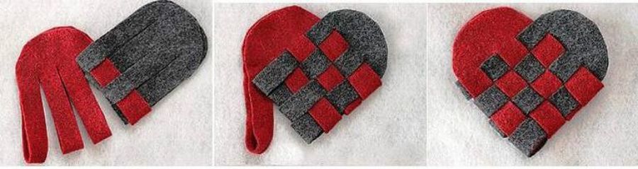 Тоже прихватки двойного назначения – плетеные сердечки из фетра. На фото показана схема производства прихваток-сердечек из фетра двух разных цветов.