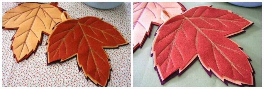 Еще интересно и красиво смотрятся прихватки в виде осенних листиков, которые также можно использовать, как подставки под горячее. Можно считать, что их предназначение является многофункциональным.
