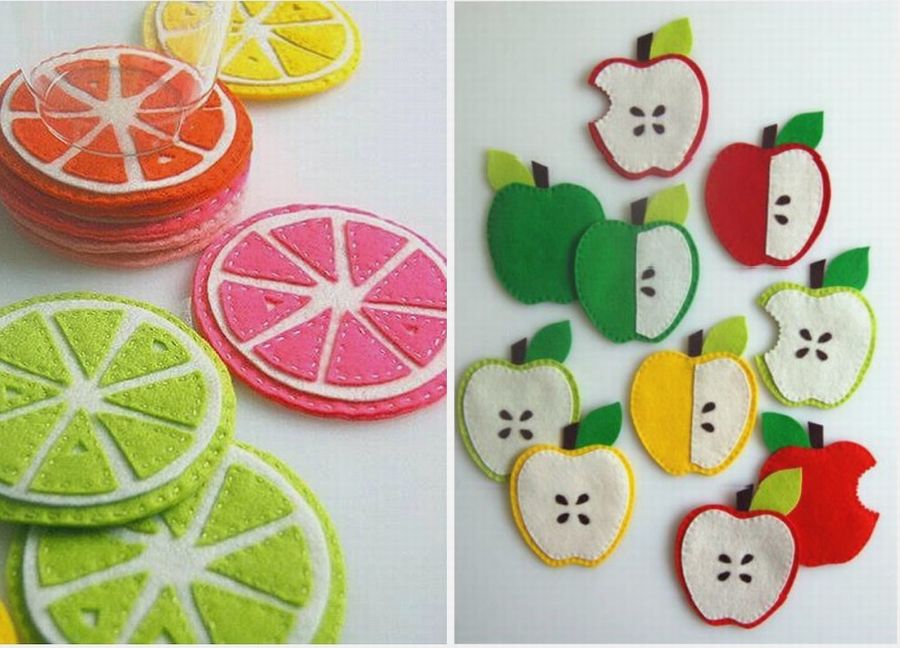 Эти изделия из фетра служат прихватками при необходимости, в других случаях могут быть подставками под горячее. Хотя в любом случае прекрасно смотрятся как яркий элемент кухонного дизайна.