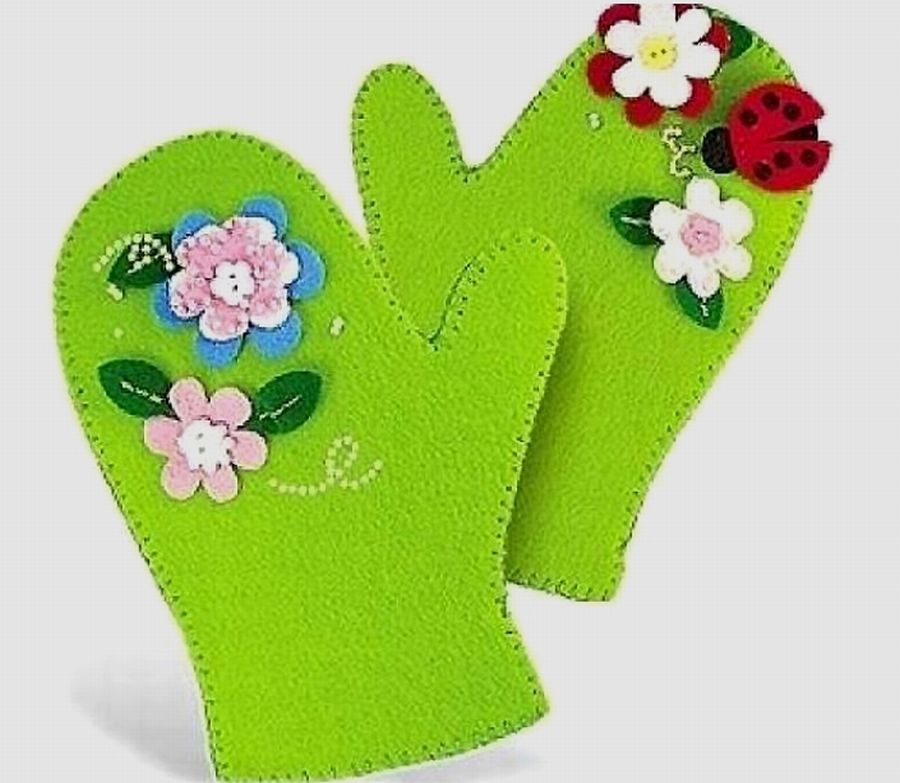 Прихватки из фетра в виде рукавицы декорированы цветочками, вырезанными опять-таки из фетра. Так что могут послужить и украшением кухни. В качестве выкройки можно использовать собственную варежку, обведя ее карандашом на листе бумаги и добавляя припуски, чтобы потом легко надевать и снимать.