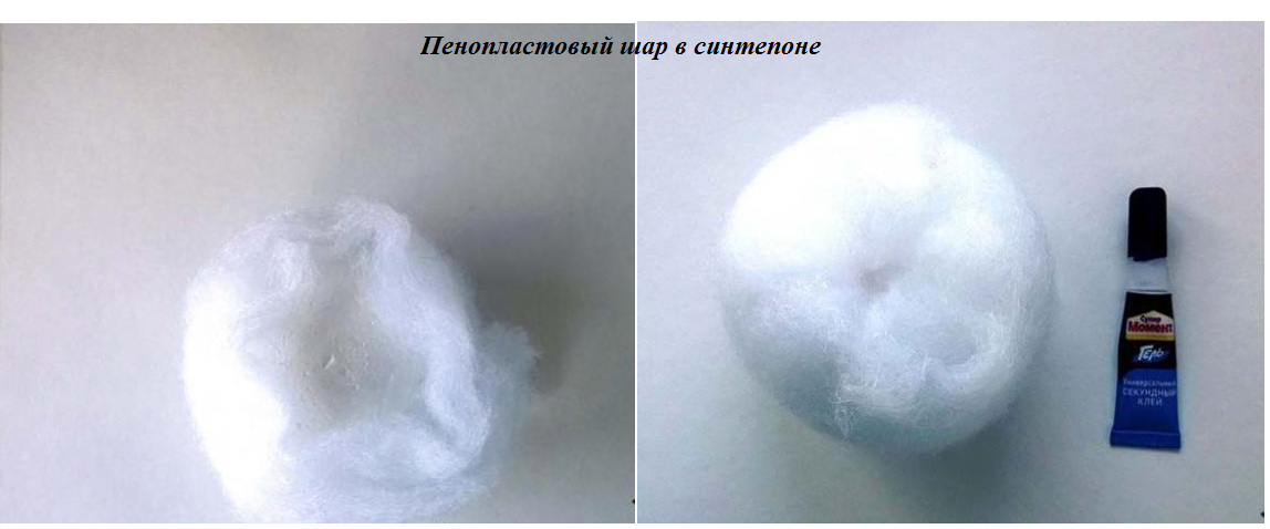 В основном используют шар в диаметре от семи до девяти сантиметров. Приготовьте шар нужного вам диаметра, отрез синтепона шириной в десять сантиметров и длиной примерно сорок, клей в виде геля момент.