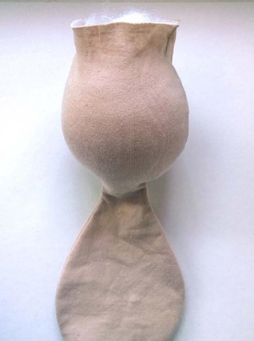 Возьмите необходимое количество синдепона и скатайте в плотный шар. Поместите получившийся шар в чулок. Ткань должна натянуться. Скатайте еще один шарик поменьше и засуньте в середину. Это будет нос. Внизу не туго завяжите чулок.