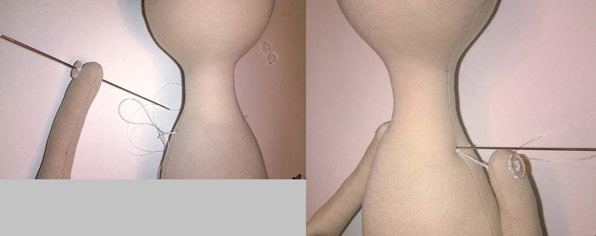 Чтобы пришить руки, сначала вы должны вырезать их детали и прошить. Затем наполнить холлофайбером. Далее приготовьте тонкую длинную иглу, две пуговки и прочную нить. Сделайте отметки с помощью карандаша на теле, в тех местах где будут крепиться руки куклы. Проткните в отметках иглой и проденьте нить через тело.
