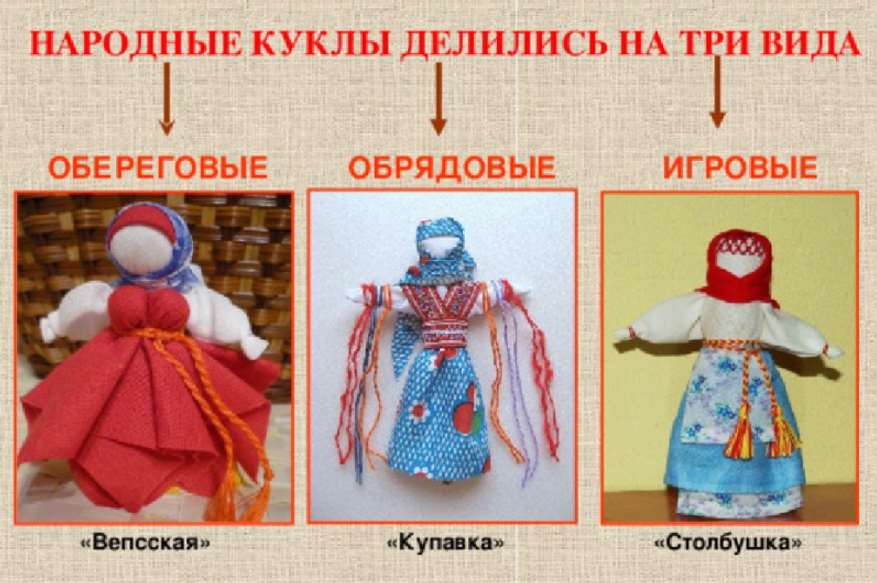 Куклы-обереги — часть народной культуры. Раньше без них не обходился ни один ребенок да и взрослому они иногда делались. Когда муж уходил на войну, вместо него во главе стола ставилась кукла. Её задачей была защита хозяина от опасностей на пути. Традиция существовала до ХХ столетия, однако изменения в государственном строе заставили забыть о ней. В наши дни всё больше людей интересует искусство создания маленьких берегинь. Куклы различались по материалу. Первые делались из золы, позже — изо льна или соломы. Для изготовления подходили глина, ткань, дерево и даже тесто. По назначению кукол делили на следующие категории: