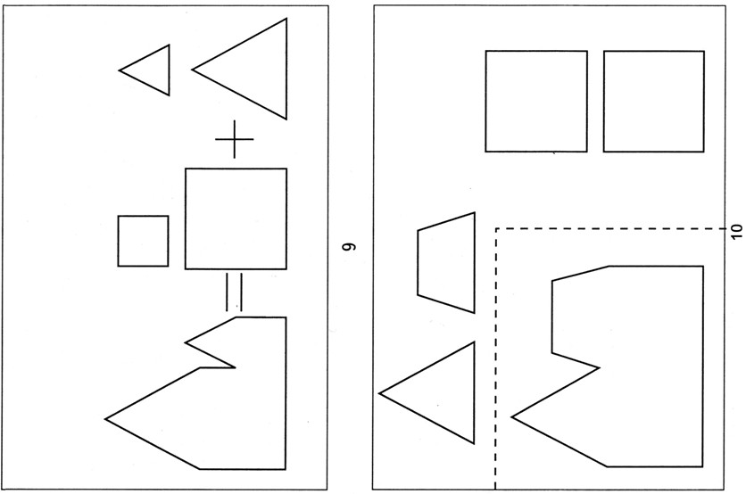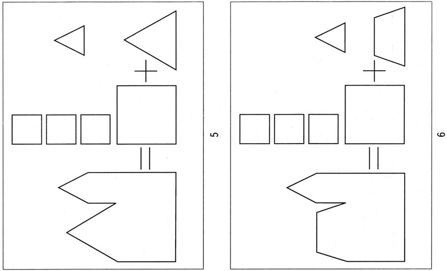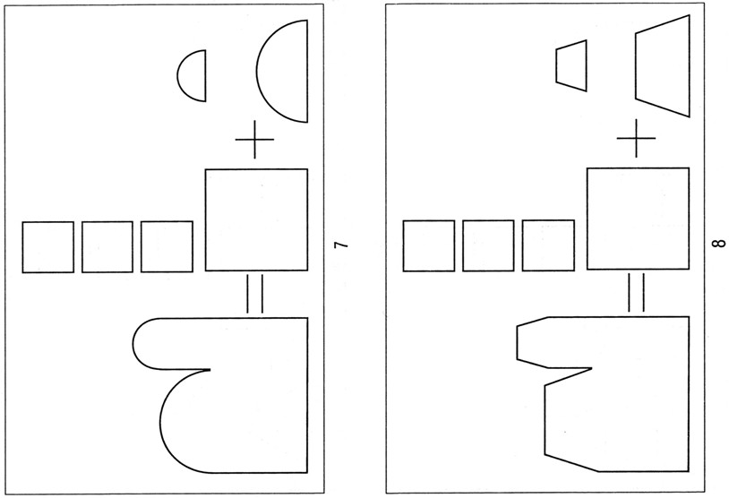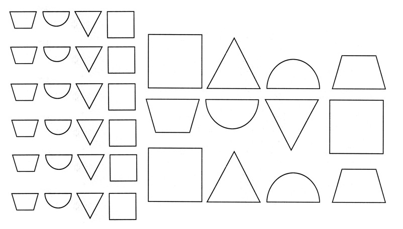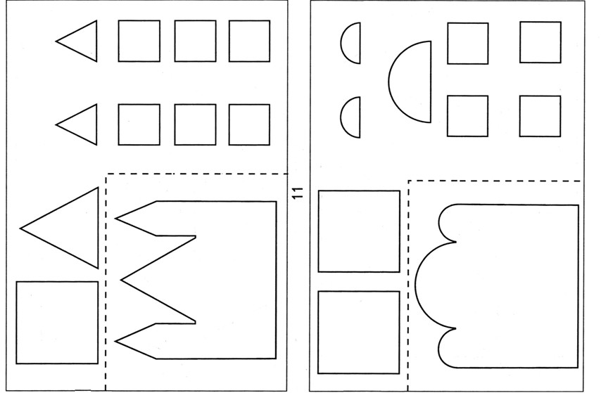 В этом упражнении вы можете скачать плоские геометрические фигуры из бумаги и построить из них замок, то есть выложить их на столе таким образом, чтобы получился заданный силуэт замка. Для начала скачайте во вложениях бланки с заданием и распечатайте на принтере. Затем вырежьте геометрические фигуры (квадрат, трапеция, полукруг и треугольник), которые даны к этому заданию. Все карточки с заданиями даны с увеличением уровня сложности (от 1 до 6 задания).
