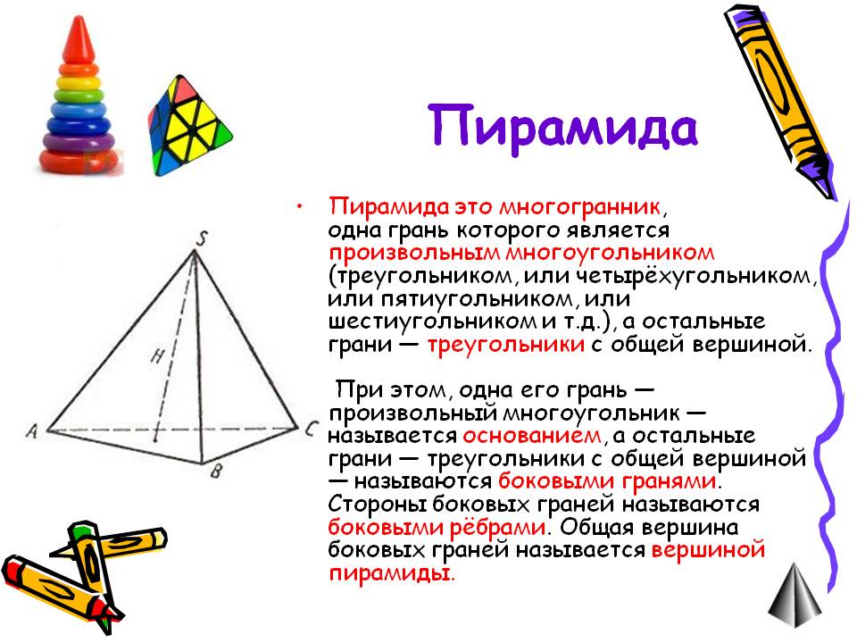 Какие бывают пирамиды. (Пусть ребенок покажет из них те, которые он склеил)