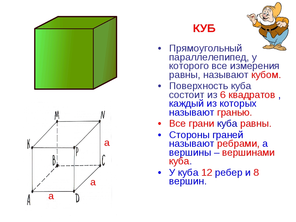 Куб — это фигура, которые мы встречаем не только на уроках геометрии и изобразительного искусства, но и в нашей повседневной жизни. Другое название куба — правильный гексаэдр. Кубом называется правильный многогранник, каждая грань которого является квадратом. Куб можно назвать объемный, трехмерным или даже 3D квадратом. Куб имеет 8 вершин, 6 граней, 12 ребер. Куб — это удивительная геометрическая фигура, в которую можно спрятать или вписать другие фигуры, например такие: октаэдр, тетраэдр, икосаэдр и другие.